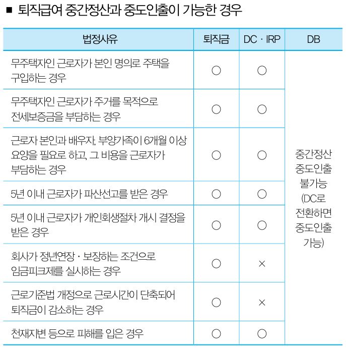 오늘은 퇴직금 일시정산 사유와 퇴직급여 조기인출 사유(DB, DC, IRP)에 대해 정리해보았습니다. 간략한 요약은 아래 게시물을 참조하십시오.